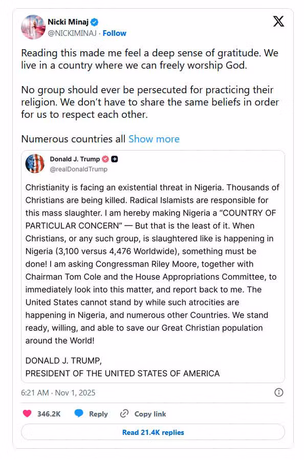La republication du TikTok pro-Trump par Nicki Minaj intervient quelques jours après qu’elle a partagé une capture d’écran d’un message publié par Trump sur Truth Social, mettant en avant les attaques contre les chrétiens au Nigeria. (Comme l’a relevé le New York Times, les coupes budgétaires décidées par Trump plus tôt cette année ont causé la mort de bien davantage de chrétiens que les groupes qu’il prétend dénoncer.)